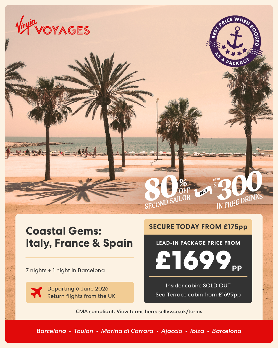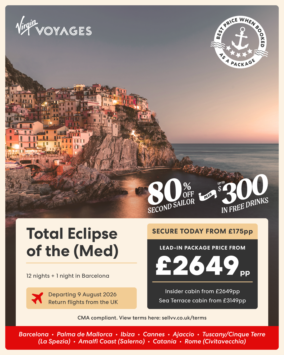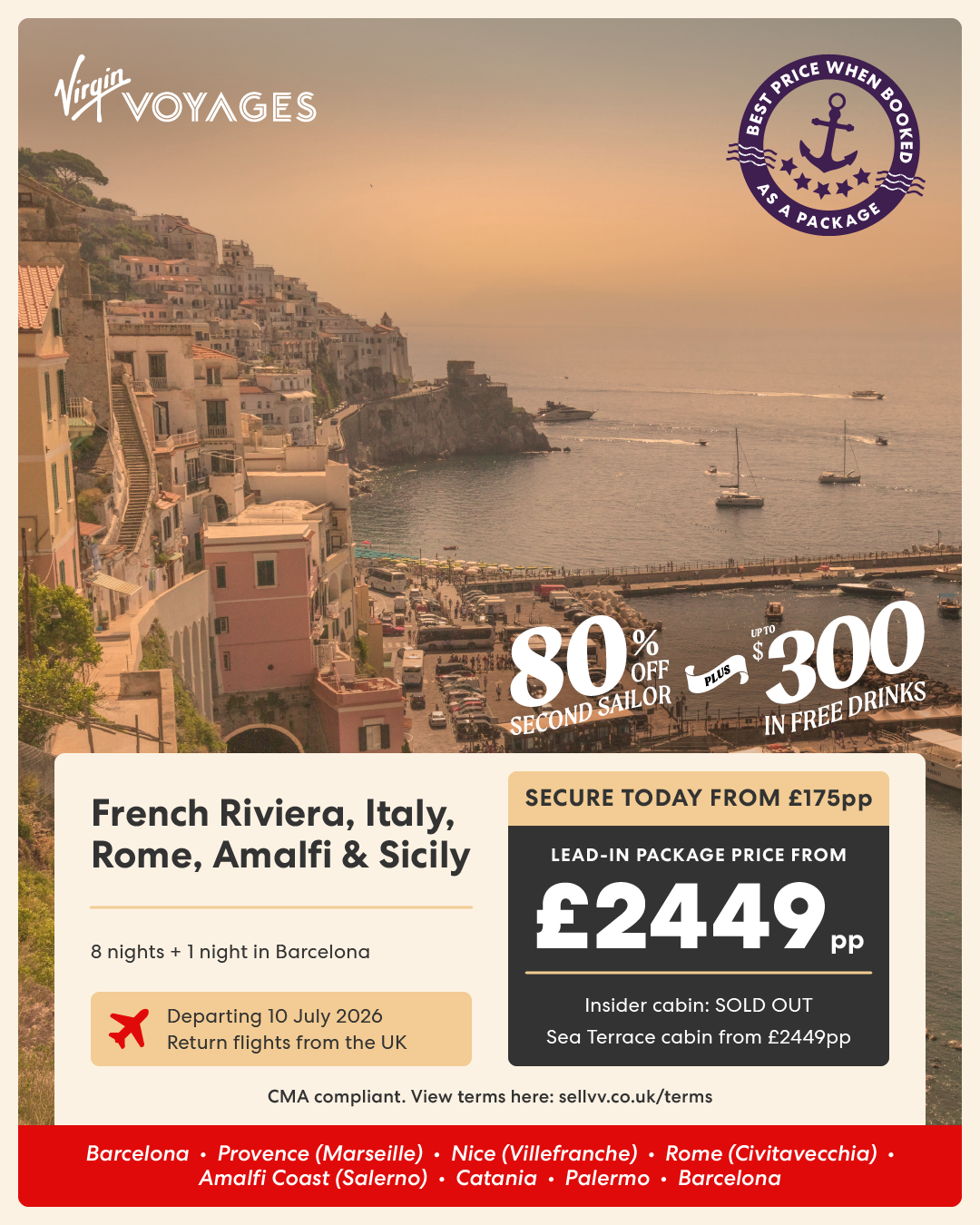 8 night French Riviera, Italy, Rome, Amalfi & Sicily + 1 night in Barcelona - 10 July 2026