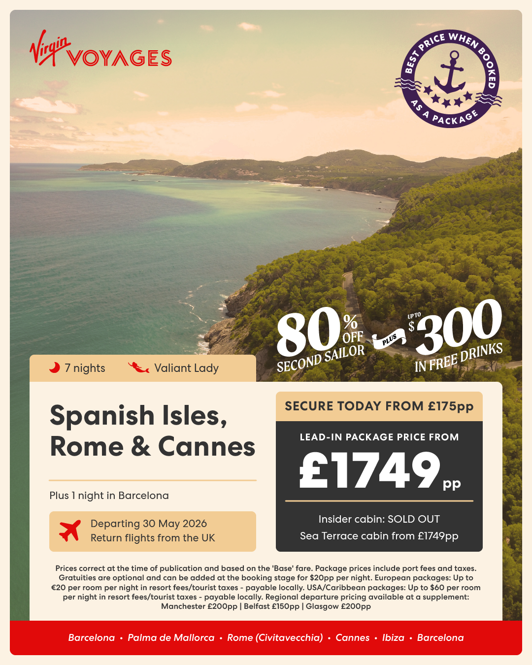 7 night Spanish Isles, Rome & Cannes + 1 night in Barcelona - 30 May 2026
