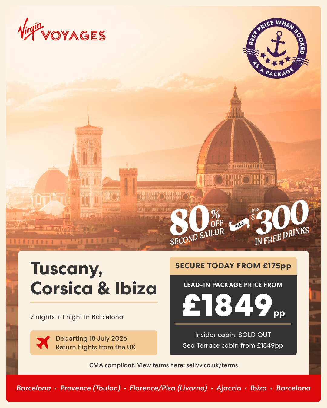 7 night Tuscany, Corsica & Ibiza + 1 night in Barcelona - 18 July 2026