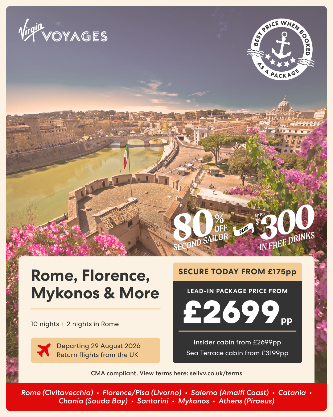 10 night Rome, Florence, Mykonos & More + 2 nights in Rome - 29 August 2026
