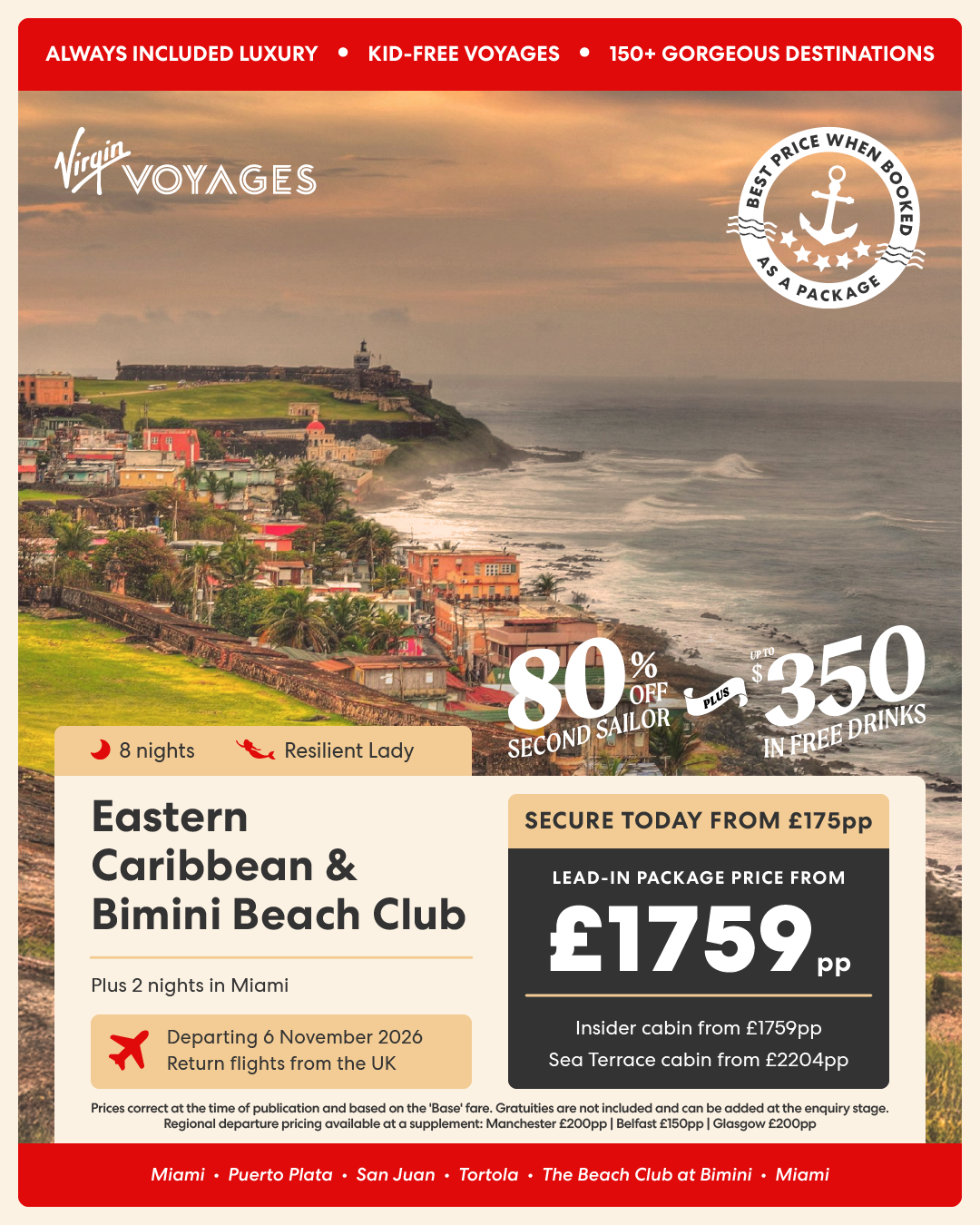 8 night Eastern Caribbean & Bimini Beach Club + 2 nights in Miami - 6 November 2026