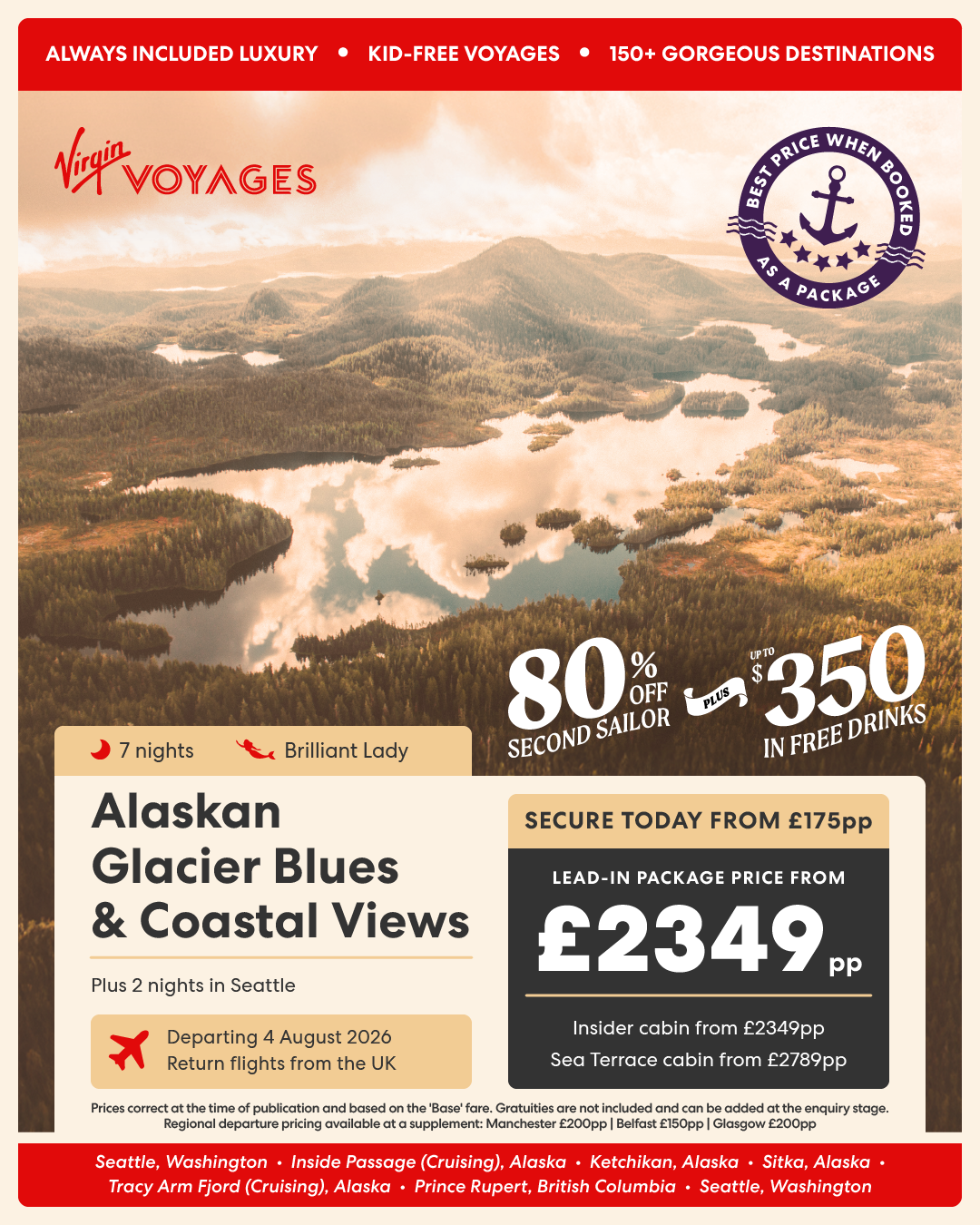 7 night Alaskan Glacier Blues & Coastal Views + 2 nights in Seattle - 4 August 2026