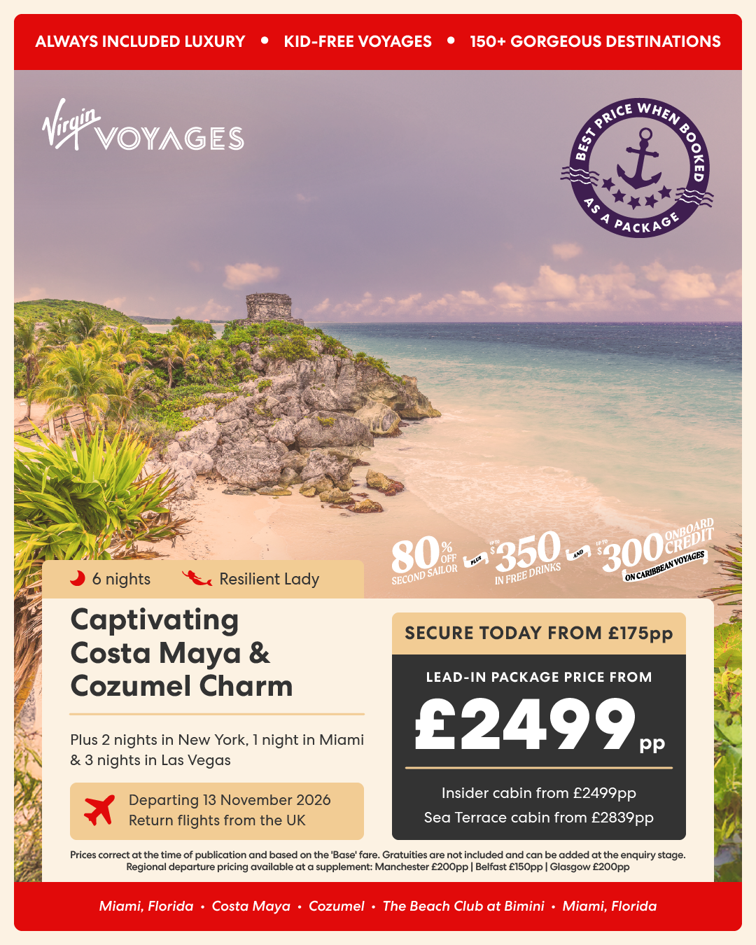 6 night Captivating Costa Maya & Cozumel Charm + 2 nights in New York + 1 night in Miami + 3 nights in Las Vegas - 13 November 2026