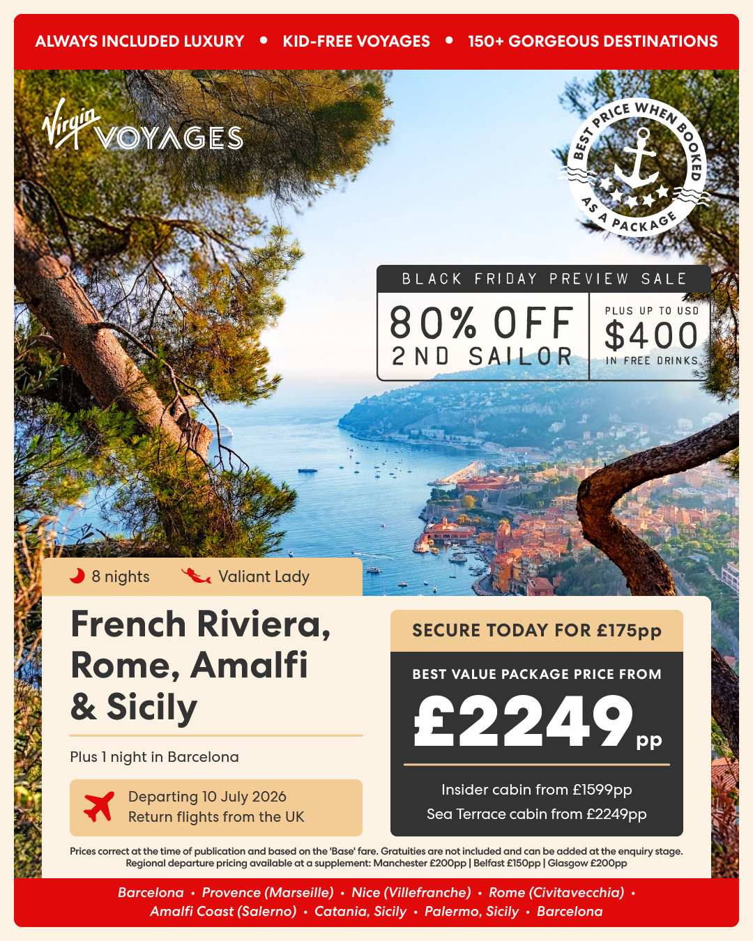 8 night French Riviera, Rome, Amalfi & Sicily + 1 night in Barcelona 10 July 2026
